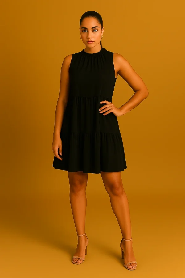 Style: Sleeveless, high-neck, tiered mini dress