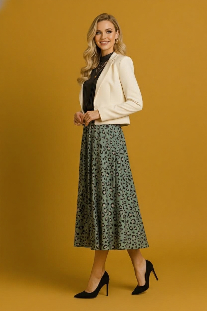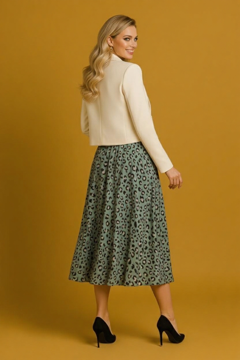This enchanting piece features an olive green backdrop with an abstract leopard print in shades of black and taupe. The skirt’s fluid drape and relaxed silhouette ensure a comfortable fit, while the print brings a touch of the wild to a sophisticated design. Perfect for those who love to blend bold patterns with classic styles, the Mystic Jungle Skirt is a versatile addition to any fashion-forward wardrobe.
